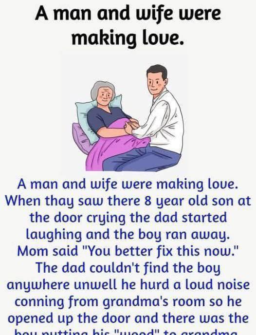 A man and wife were making love. When thay saw there 8 year old son at the door crying the dad started laughing and the boy ran away. Mom said “You better fix this now.” The dad couldn’t