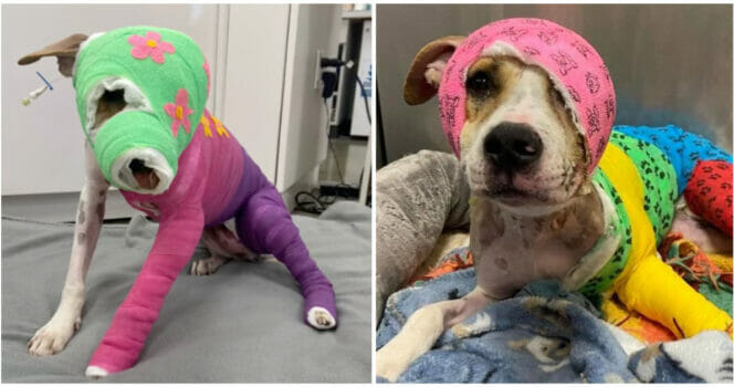 Riona’s ear was burnt off, but thankfully her left eye was saved after emergency medical response. She was taken in by Tails of Hope Dog Rescue, and received medical treatments at Bluff City Veterinary Specialists. She was given twice daily full body wraps to protect her skin.