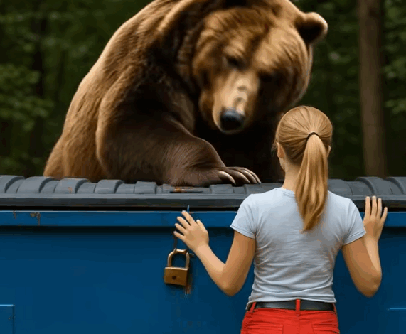 At first, I assumed she was after food. That was common enough — the bins always held leftovers and scraps that lured animals from miles away. But the more I watched her, the more uneasy I felt. Her movements weren’t random. She wasn’t clawing or prying; she was pounding, looking at me, then pounding again, like she was trying to tell me something.