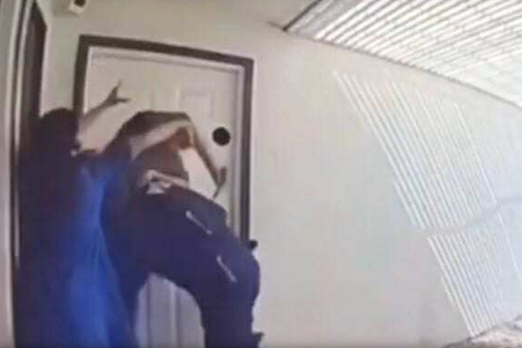 The video, now widely shared online, shows the suspect barreling toward the officer near a front doorway.