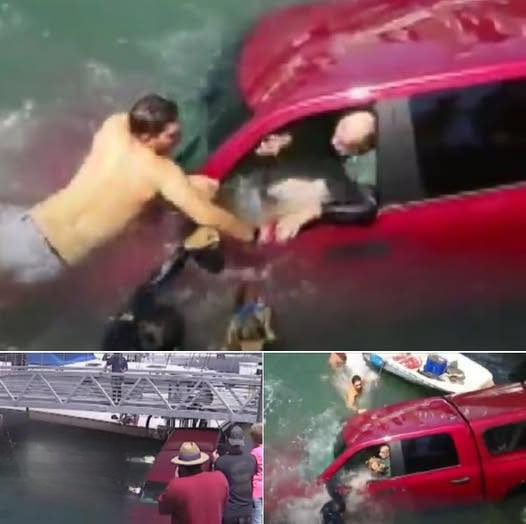 Security footage later provided a chilling view of the incident. The truck, moving with considerable force, tore through the railing as though it were nothing more than paper. Within seconds, the vehicle was submerged nose-first into the marina’s deep water. Witnesses watched in horror as the couple and their small dog became trapped inside the rapidly sinking vehicle. The scene unfolded so quickly that there was little time for hesitation or careful thought—every passing second counted.